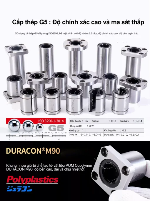 Website: cncmotion.vn • Hỗ trợ kỹ thuật & báo giá nhanh. Bi lăn tuần hoàn tạo ra bề mặt lăn giữa bạc và trục → ma sát rất thấp, chuyển động êm & độ chính xác lặp lại cao. Bích tròn cho phép xoay nhẹ khi lắp để căn chỉnh đồng tâm. *Thông số mang tính tham khảo; có thể thay đổi theo từng hãng. Vui lòng đối chiếu catalog khi đặt hàng. Ghi chú: PCD là đường kính vòng lỗ bắt bulong của bích tròn; kiểm tra đúng theo catalog của hãng trước khi gia công bích/khung. Dụng cụ: thước cặp, thước thẳng, lục giác, mỡ NLGI #2, bulong theo lỗ S, cờ lê lực (khuyến nghị). Mẹo: bích tròn cho phép xoay nhẹ để căn đồng tâm; đánh dấu vị trí sau khi đã tối ưu để dễ bảo trì.Bi trượt tròn LMF-UU – bạc trượt bi tuyến tính