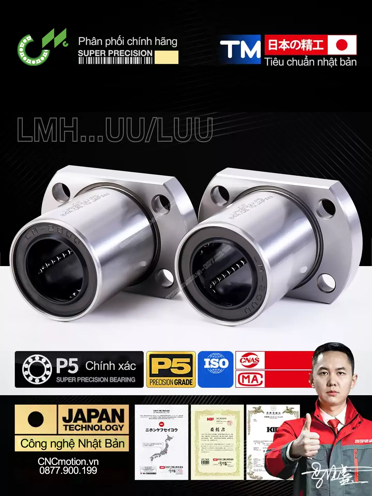LMH-LUU (long type) – bản dài của LMH-UU, tăng khả năng chịu tải & độ bền, phù hợp hành trình dài trong CNC, tự động hóa.
