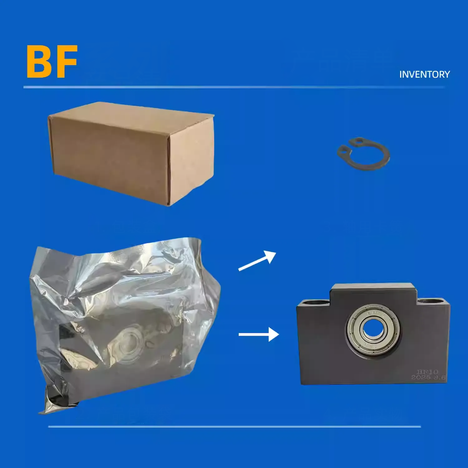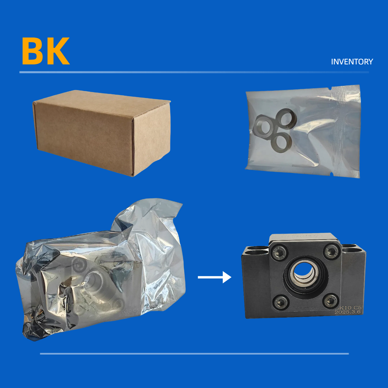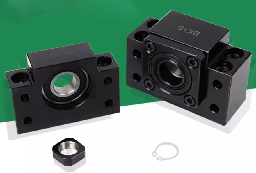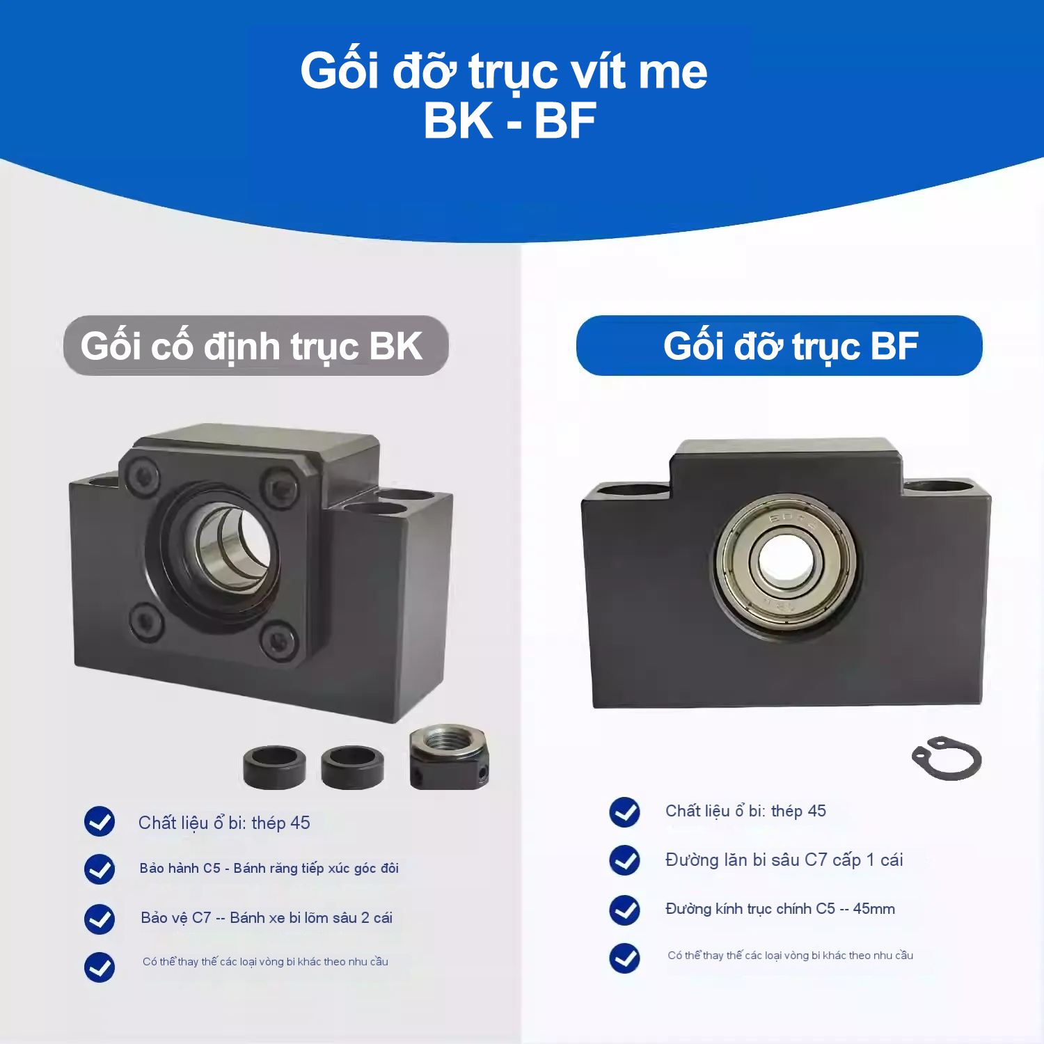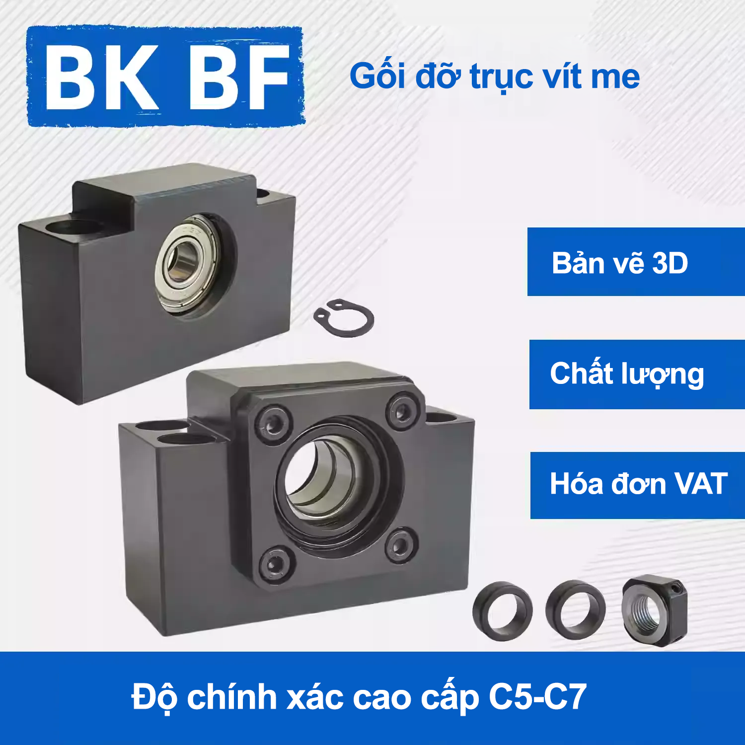 BK lắp ở đầu cố định, giữ chặt trục vít me bằng ổ bi chặn 2 dãy, chịu tải dọc trục. BF lắp ở đầu tự do, cho phép trục quay nhẹ nhàng và giãn nở nhiệt. Sự kết hợp BK – BF giúp trục vít me ổn định, chính xác, tăng tuổi thọ.