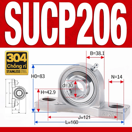 Gối đỡ vòng bi SUCP206 (Inox 304 - Đường kính trong 30 mm)
