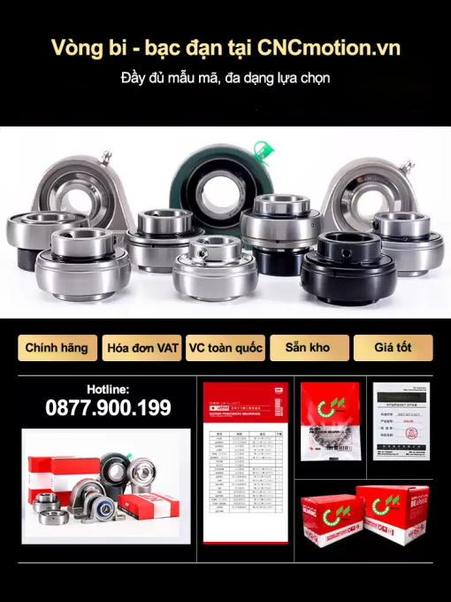 bao phủ dải mã bạn cung cấp: UCP201–220, UCP305–320, UCF203–208, UCF305–320, UCFC204–212, UCFL204–212, UCPA204–212, UCT204–212, UC204–220, UC305–320, SUCP204–215, SUCF204–215, SUCFL204–215, SUCT204–215, SUC201–210. Gửi mã/đường kính trục để CNC Motion đề xuất model, vật liệu và kiểu phớt phù hợp. Dòng 305–320 dùng thân lớn, gân tăng cứng – phù hợp tải nặng, xung lực. Ổ chèn UC dùng thay thế vào các vỏ P/F/FL/FC/T… hoặc lắp riêng theo thiết kế. Biến thể inox dùng thân & ổ chèn thép không gỉ, phớt phù hợp vệ sinh – thích hợp chế biến thực phẩm, dược phẩm, ngoài trời, môi trường ẩm/ăn mòn. Lưu ý: Kích thước lỗ bắt, bước lỗ, kích thước thân có thể khác giữa các hãng. Hãy gửi mã/ứng dụng để được đề xuất đúng model.Gối đỡ vòng bi UC & SUC | UCP • UCF • UCFL • UCFC • UCT • UCPA • UC | Dải mã 201–220 & 305–320 | Inox SUC-series | CNC Motion