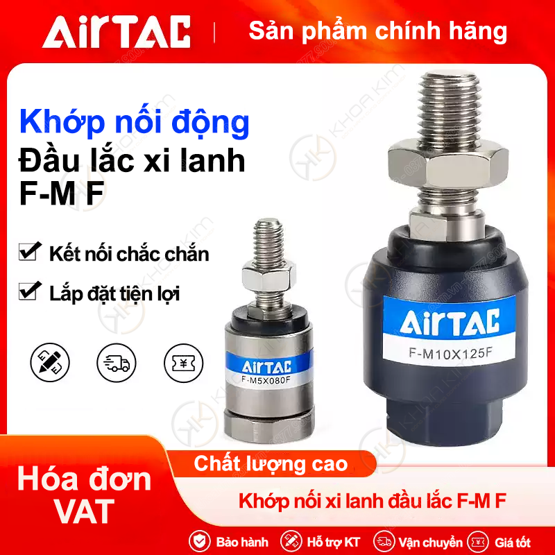 Tự động hóa Khoa Kim – Cung cấp phụ kiện xi lanh Airtac: khớp nối F-M, đầu ty, khớp cầu, gá lắp, xy lanh tiêu chuẩn & phụ tùng thay thế. Tip: Khi cơ cấu có rung/độ lệch nhỏ, hãy kết hợp khớp nối F-M với khớp cầu/rod end phù hợp để tăng tuổi thọ. Mẹo: Nếu cơ cấu làm việc rung hoặc tải thay đổi, nên kiểm tra định kỳ điểm ren và độ rơ để tránh mòn/rụng chi tiết. Danh sách dưới đây bao gồm đầy đủ tất cả mã bạn yêu cầu, chia theo nhóm biến thể U / F / Y / I để dễ tìm nhanh. Có sẵn đầy đủ dải ren M3–M42, chiều dài X050–X200, hỗ trợ chọn đúng mã theo xi lanh và cơ cấu lắp.F-M Series – Phụ kiện khớp nối ty xi lanh Airtac (Rod Coupling / Connector)