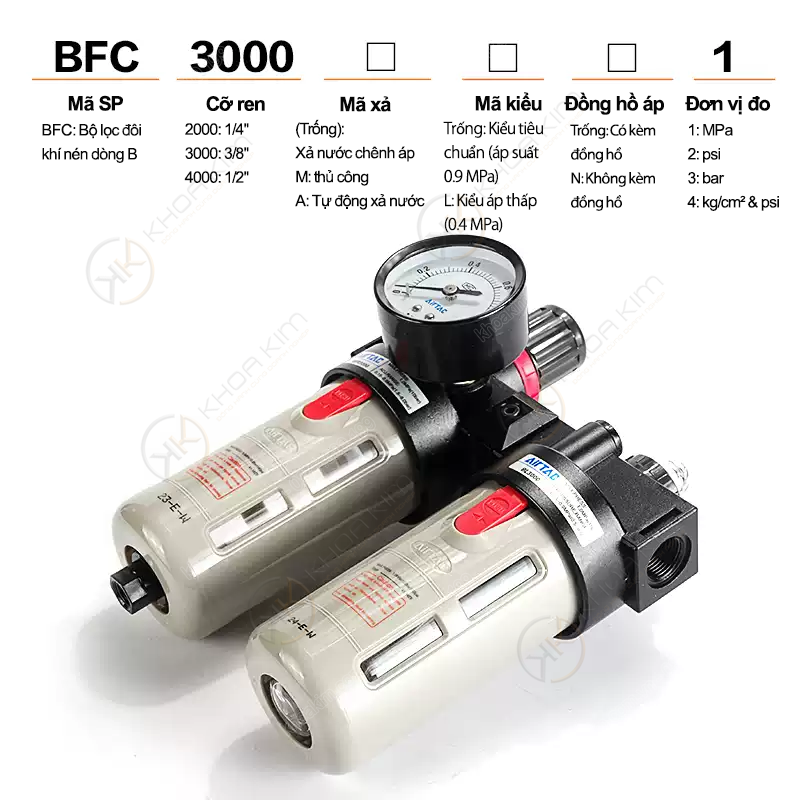 và tuổi thọ thiết bị càng cao. Thông số cụ thể có thể thay đổi theo từng model. Khi cần đối chiếu datasheet chính xác, hãy gửi mã chi tiết cho kỹ sư hỗ trợ. Dưới đây là toàn bộ mã bạn yêu cầu, được gom theo nhóm để dễ tra cứu, đặt hàng và tối ưu nội dung SEO. Tự động hóa Khoa Kim hỗ trợ chọn đúng mã AFC/BFC theo áp suất, lưu lượng, cổng ren và không gian lắp đặt thực tế tại nhà máy.AFC / BFC Series – Bộ lọc đôi khí nén Airtac (Filter + Regulator)