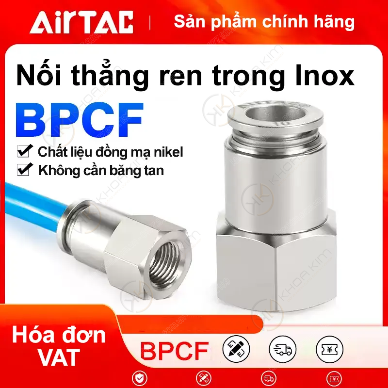 Nối nhanh Inox BPCF – Airtac chính hãng do Khoa Kim Việt Nam phân phối là dòng cút nối nhanh thẳng ren trong bằng inox (stainless steel one-touch female connector) chuyên dùng trong hệ thống khí nén yêu cầu độ bền cao, chống ăn mòn và đảm bảo vệ sinh. Sản phẩm được chế tạo hoàn toàn từ thép không gỉ chất lượng cao, phù hợp với các môi trường làm việc khắc nghiệt như ẩm ướt, hóa chất nhẹ, thực phẩm, dược phẩm và các dây chuyền sản xuất yêu cầu tiêu chuẩn sạch.