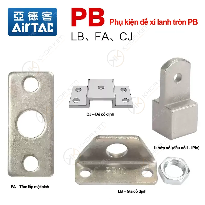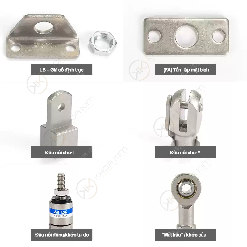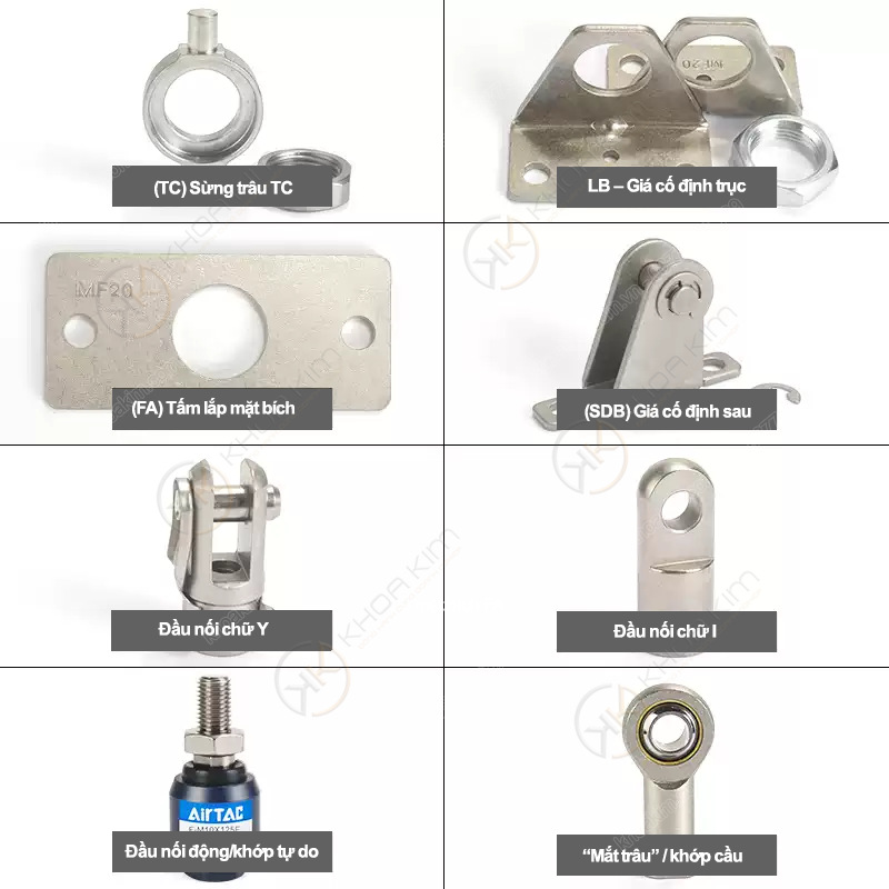 Khoa Kim Việt Nam – Cung cấp đầy đủ phụ kiện khí nén Airtac: xi lanh, van, cút nối nhanh, ống khí, bộ xử lý khí & phụ kiện lắp đặt. Mẹo kỹ sư: Nếu ty làm việc có tải lệch hoặc rung, ưu tiên kiểu gá tăng cứng vững (FA/LB phù hợp khung chắc). Khuyến nghị: Khi mua phụ kiện đầu ty, nên gửi kèm đường kính ty, kiểu liên kết và không gian lắp để chọn đúng. Nếu bạn gửi ảnh vị trí lắp hoặc bản vẽ, kỹ sư có thể chốt nhanh đúng kiểu phụ kiện trong 1–2 phút để tránh đặt nhầm. Danh sách dưới đây bao gồm toàn bộ mã bạn yêu cầu, chia theo nhóm để dễ tra cứu và đăng sản phẩm/SEO. Nhóm này thường dùng để đồng bộ lắp đặt và cố định trong các cụm gá,