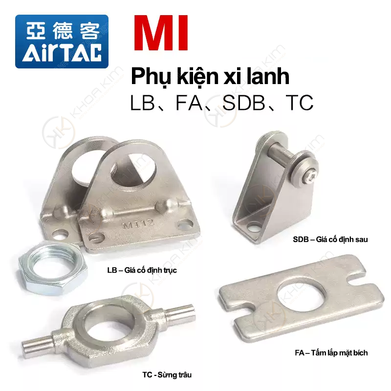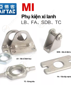 và chiều dài tiêu chuẩn (070, 100, 125). Phần hậu tố I / Y / F / U là biến thể theo chuẩn phụ kiện. Có sẵn đầy đủ phụ kiện MI8–MI40: LB / FA / SDB / TC và nhóm ty liên kết ren M4–M12 (I/Y/F/U). Hỗ trợ chọn đúng mã theo ứng dụng.Phụ kiện xi lanh tròn mini MI Airtac – Giá đỡ, khớp nối, ty liên kết & phụ kiện lắp đặt chuẩn công nghiệp