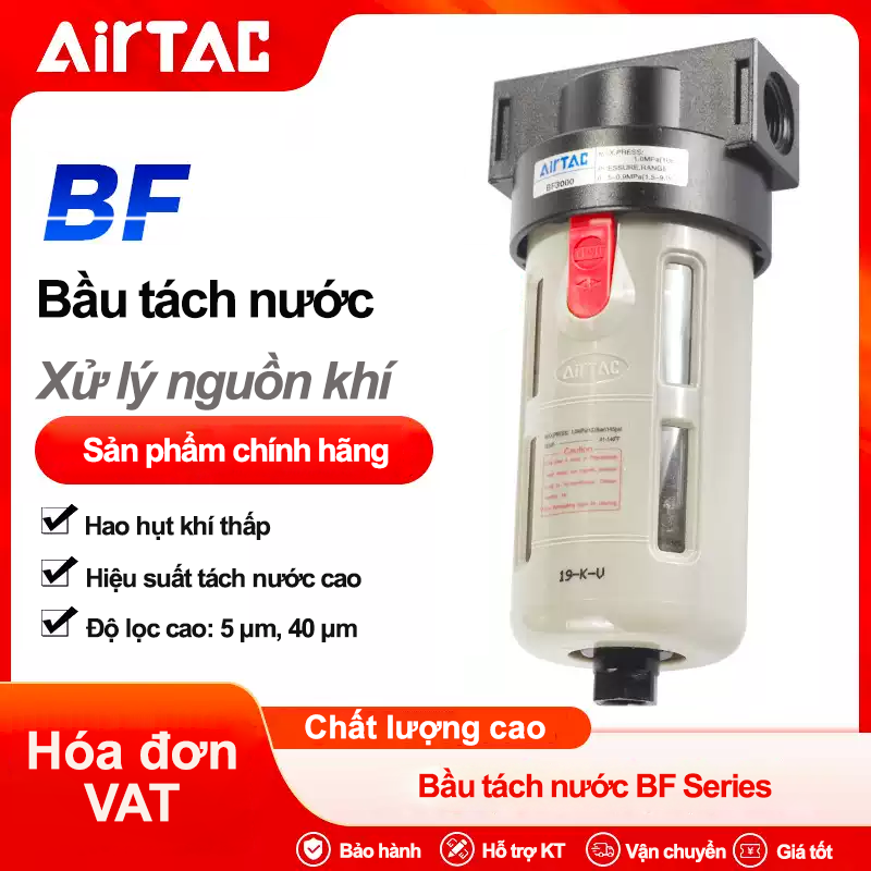 Tách nước BF – Airtac chính hãng do Khoa Kim Việt Nam phân phối là thiết bị bầu tách nước và lọc khí nén sơ cấp, chuyên dùng để loại bỏ hơi nước ngưng tụ, bụi bẩn và tạp chất có kích thước lớn trong hệ thống khí nén. Dòng BF Airtac thường được lắp đặt ngay sau máy nén khí hoặc trước các cụm van – xy lanh quan trọng, giúp đảm bảo nguồn khí đầu vào sạch và khô, từ đó nâng cao hiệu suất vận hành và độ bền của thiết bị.