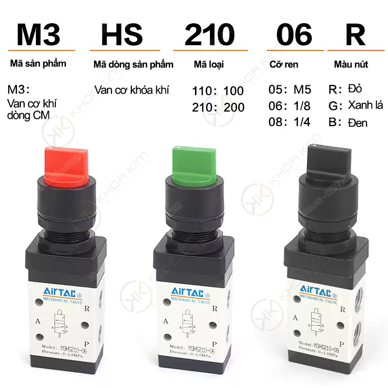 Tự động hóa Khoa Kim – Cung cấp van cơ khí Airtac M3 Series, cút nối nhanh, ống khí, bộ lọc – điều áp – bôi trơn, van điện từ, xy-lanh… Lưu ý: M3 Series có nhiều biến thể cổng và kiểu tác động. Nếu bạn cần đối chiếu chính xác chức năng/đường khí theo từng mã,