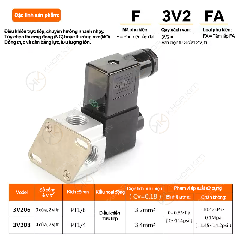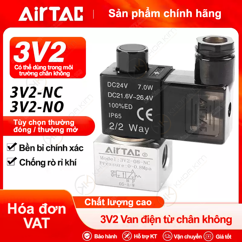 Tự động hóa Khoa Kim – Cung cấp van điện từ Airtac chính hãng (2V/3V/4V/7V), coil thay thế, đế manifold, cút nối nhanh, ống khí… Mẹo kỹ sư: nếu cần “an toàn khi mất điện” (dừng máy – đóng khí), ưu tiên NC. Lưu ý: Thông số chi tiết (áp suất, lưu lượng, thời gian đáp ứng, cấp bảo vệ coil…) phụ thuộc datasheet từng biến thể.
