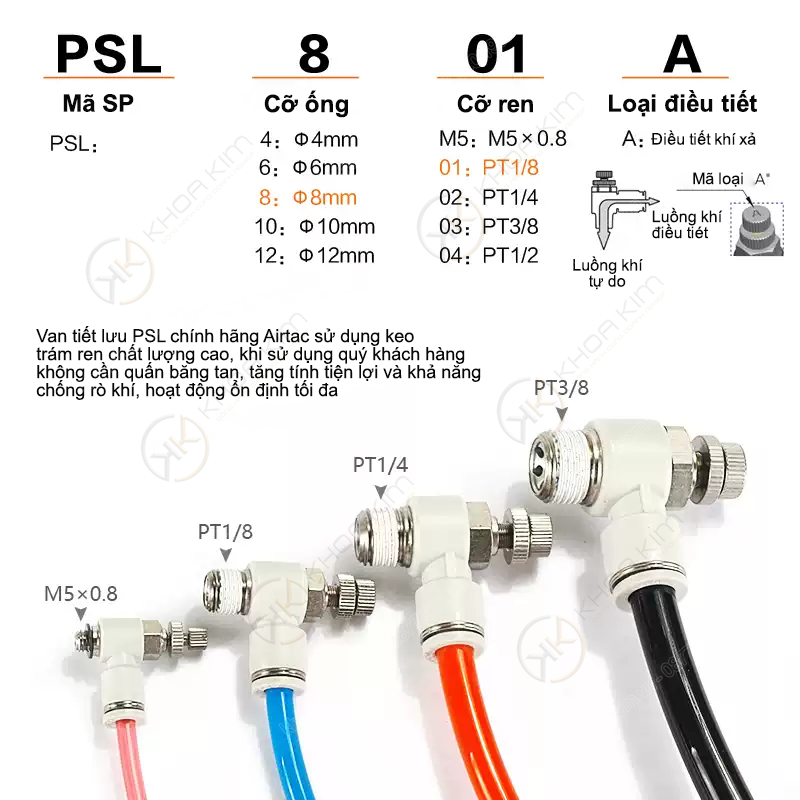 Van tiết lưu PSL-A – Airtac chính hãng do Khoa Kim Việt Nam phân phối là dòng van điều chỉnh lưu lượng khí nén dạng góc (speed controller elbow type), được thiết kế chuyên dụng để kiểm soát tốc độ chuyển động của xy-lanh một cách chính xác và ổn định. Với cơ chế điều chỉnh lưu lượng khí xả, PSL-A giúp tối ưu hiệu suất hoạt động, giảm rung giật và tăng tuổi thọ cho thiết bị trong hệ thống khí nén.