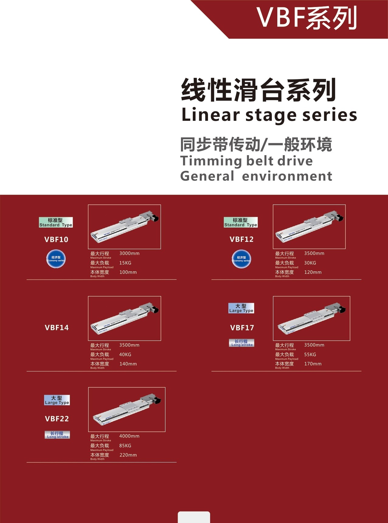 Website: cncmotion.vn • Đại lý W-Robot Việt Nam – tư vấn kỹ thuật & báo giá nhanh. *Thông số có thể thay đổi tùy hành trình và cấu hình servo; vui lòng đối chiếu catalog gốc để xác nhận. *VBF ưu tiên tốc độ & tải, trong khi VGTB ưu tiên môi trường sạch & độ ổn định bụi thấp.VBF Series – Module tuyến tính điện tích hợp - dây đai (Timing Belt Drive Linear Stage)