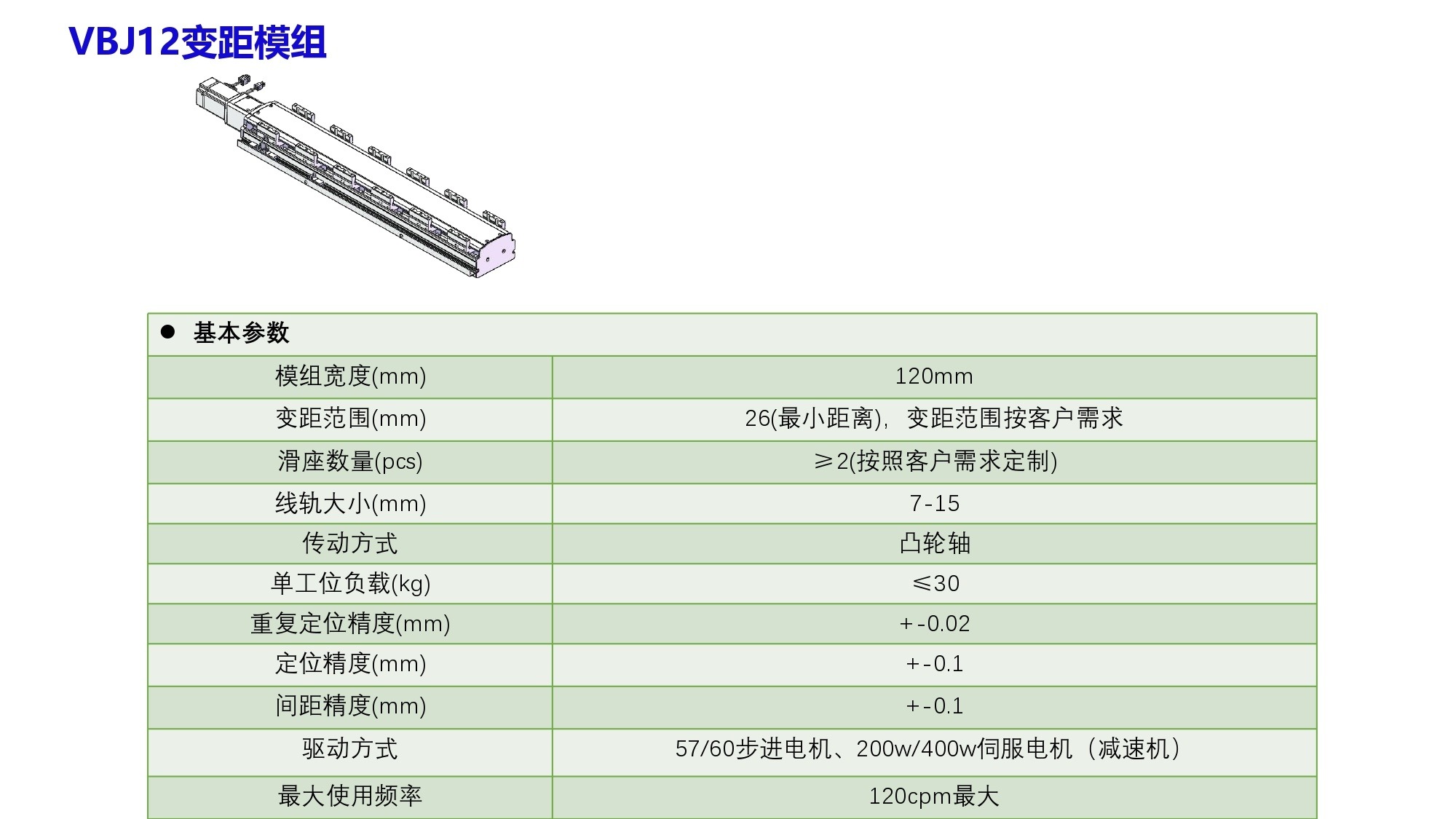 CNC Motion Việt Nam – Đại lý W-Robot: tư vấn bài toán chia khoảng, đồng bộ đa trục, thiết kế – lắp đặt trọn gói. *Số bàn trượt tiêu chuẩn; có thể tùy biến theo yêu cầu. **Dải pitch (khoảng cách) mang tính tham chiếu, phụ thuộc kích cỡ sản phẩm, đồ gá và cấu hình servo. Phù hợp bao bì, FMCG – tạo pitch nhanh trước khi vào máy dán nhãn/đếm/kiểm. Luôn dùng chặn cơ khí hai đầu, giới hạn mềm trong PLC/drive và E-stop ở vị trí thuận tiện.VBJ Series – Module tuyến tính thay đổi biên dạng (Variable Pitch) cho dây chuyền tự động hóa linh hoạt