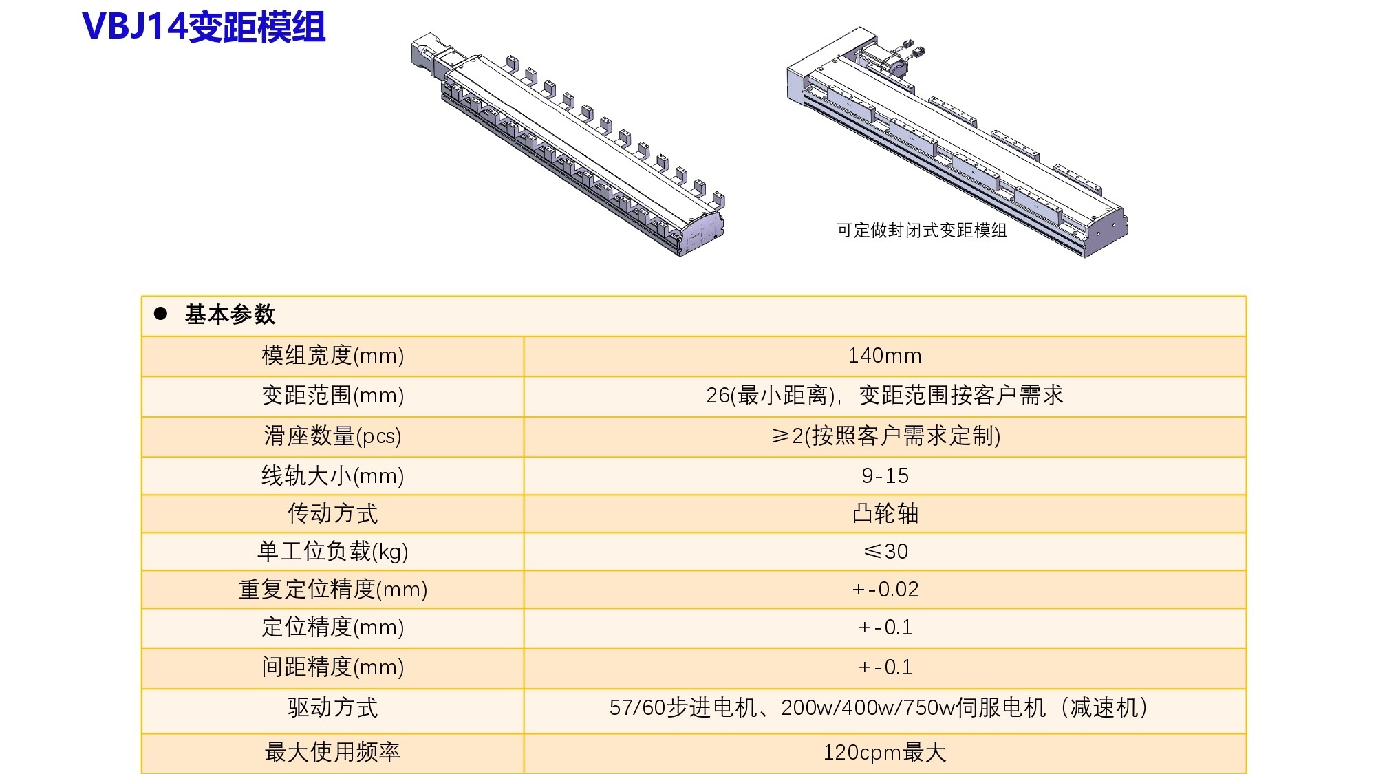 VBJ Series là dòng module tuyến tính thay đổi biên dạng (Variable Pitch Linear Module) được thiết kế cho các dây chuyền hiện đại, nơi khoảng cách giữa vật thể/đồ gá cần liên tục thay đổi để phù hợp khâu công nghệ: dồn sản phẩm cho khâu đóng gói, giãn khoảng để kiểm tra – in/scan, đồng bộ nhiều bàn trượt theo recipe linh hoạt, hoặc thực hiện thao tác “thu – trải” trước/giữa/sau công đoạn.