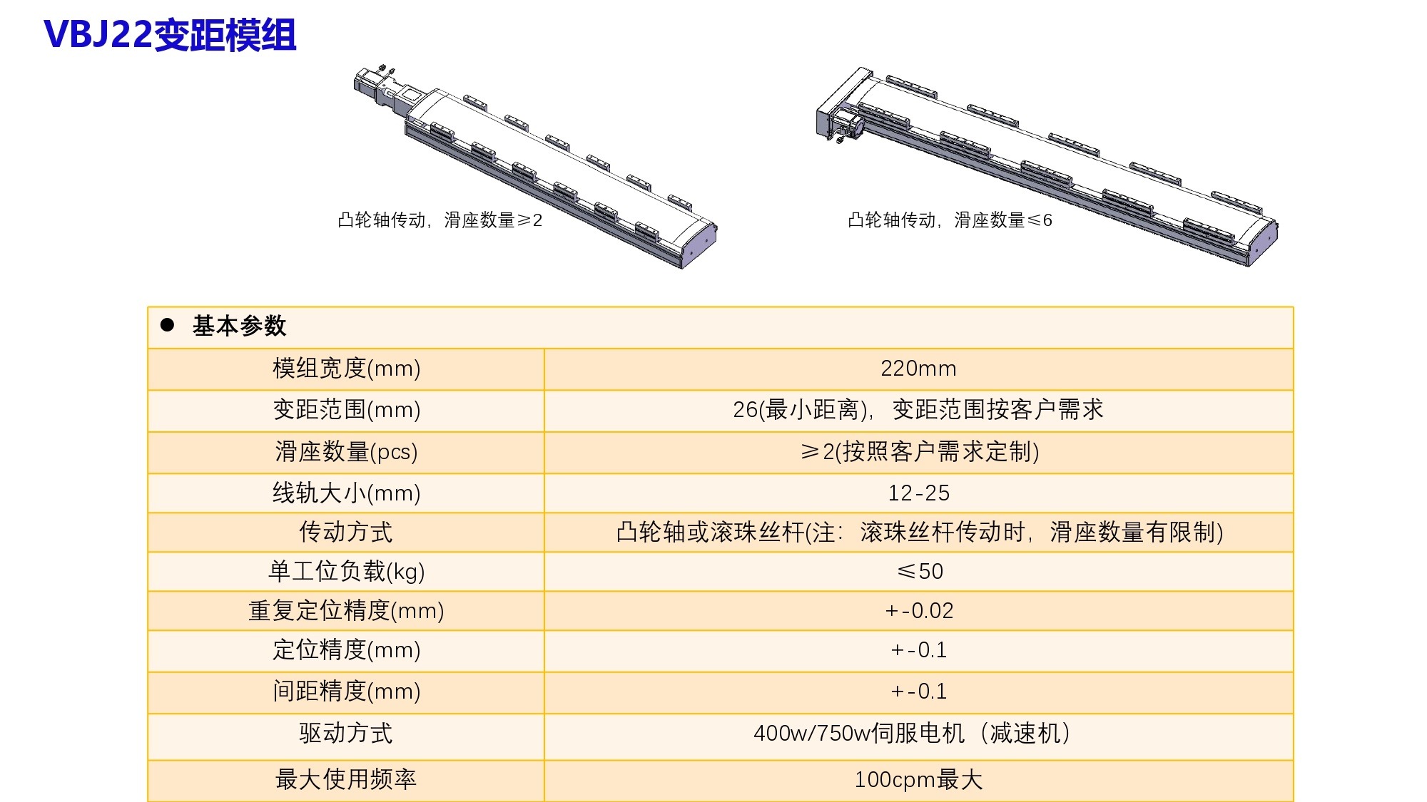 CNC Motion Việt Nam – Đại lý W-Robot: tư vấn bài toán chia khoảng, đồng bộ đa trục, thiết kế – lắp đặt trọn gói. *Số bàn trượt tiêu chuẩn; có thể tùy biến theo yêu cầu. **Dải pitch (khoảng cách) mang tính tham chiếu, phụ thuộc kích cỡ sản phẩm, đồ gá và cấu hình servo. Phù hợp bao bì, FMCG – tạo pitch nhanh trước khi vào máy dán nhãn/đếm/kiểm. Luôn dùng chặn cơ khí hai đầu, giới hạn mềm trong PLC/drive và E-stop ở vị trí thuận tiện.VBJ Series – Module tuyến tính thay đổi biên dạng (Variable Pitch) cho dây chuyền tự động hóa linh hoạt