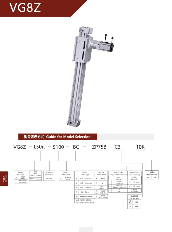 Thân nhôm đùn cứng vững kết hợp ray dẫn hướng tuyến tính bảo đảm độ thẳng, độ cứng và tuổi thọ trong môi trường công nghiệp. Bàn trượt có mặt bích lỗ ren chuẩn để bắt gripper/EOAT, đồ gá, đầu cắt… Các model VG tương thích servo đa chuẩn (Panasonic, Mitsubishi, Yaskawa, Delta…), linh hoạt cấu hình moter trái/phải và cảm biến NPN/PNP cho Home/Limit.