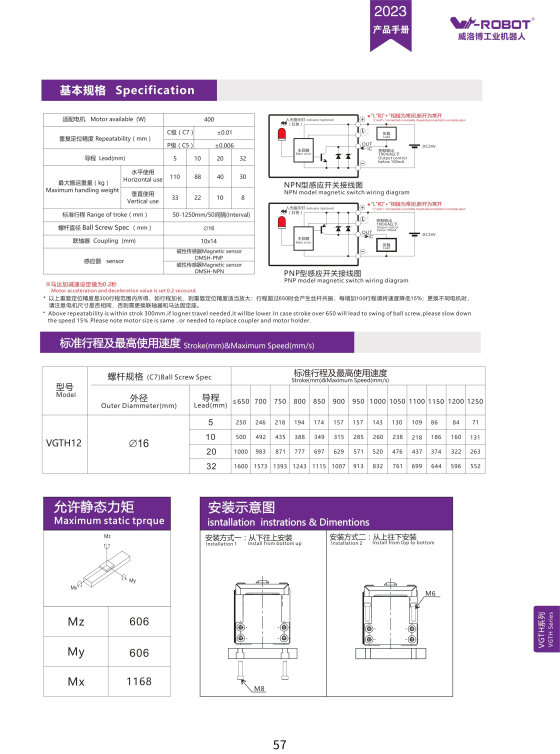 Website: cncmotion.vn • Đại lý W-Robot Việt Nam – tư vấn kỹ thuật & báo giá nhanh. *Thông số có thể thay đổi theo cấu hình lead, công suất motor và bố trí lắp đặt; kiểm tra catalog model cụ thể trước khi chốt thiết kế. Bảng dưới trình bày tốc độ tối đa (mm/s) theo lead và hành trình. Với stroke > 650 mm, khuyến nghị giảm ~15% tốc độ để hạn chế dao động trục vít. *Giá trị sắp xếp theo bảng “Stroke & Maximum Speed” của VGTH20 (ô mốc). Khi thiết kế thực tế, vui lòng đối chiếu catalog gốc để chọn biên vận hành an toàn. *Có thể thêm lựa chọn phanh (brake) theo yêu cầu an toàn khi lắp dọc trục. Kết luận: VGTH Series phù hợp hệ thống yêu cầu độ chính xác cao, linh hoạt điều khiển, độ bền chu kỳ; khí nén thích hợp các thao tác on/off đơn giản.Module tuyến tính VGTH Series – Vít me bi kín hoàn toàn, độ chính xác cấp micron