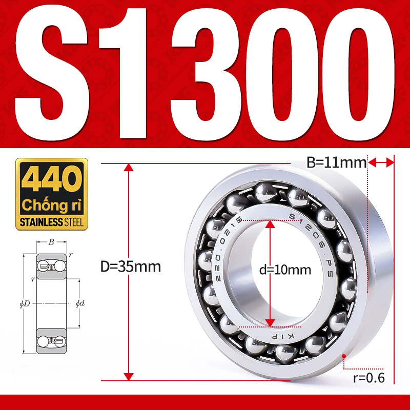Vòng bi - bạc đạn tự lựa S1300 (Chống ăn mòn - Inox 404C - 10*35*11 mm)