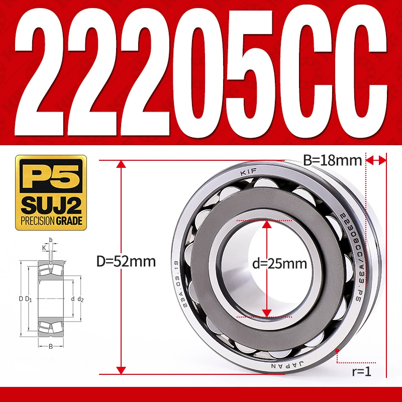 Vòng bi cà na tự lựa 2 dãy - bạc đạn cà na 22205CC/W33 (Có rãnh bôi trơn - lồng cách bi Thép - kt 25*52*18 mm)