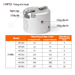 nếu kẹp dạng hộp/phiến, 2 chấu (HFCI) thường tối ưu chi phí và gia công chấu. Lưu ý: Lực kẹp và hành trình mở phụ thuộc vào từng model cụ thể và dạng chấu. Nếu bạn gửi thông tin tải (khối lượng),
