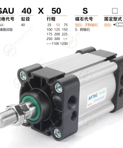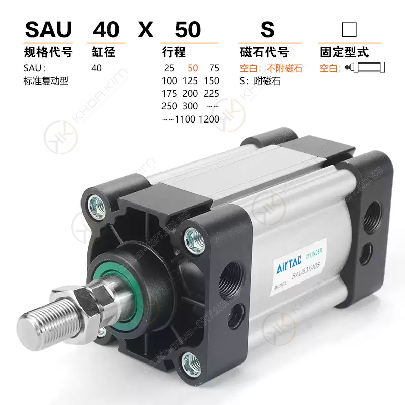 SAU[Ø][X][hành trình]S – ví dụ: SAU40X100S là xi lanh SAU, Ø40, hành trình 100 mm.Bảng mã xi lanh SAU Airtac theo đường kính & hành trình