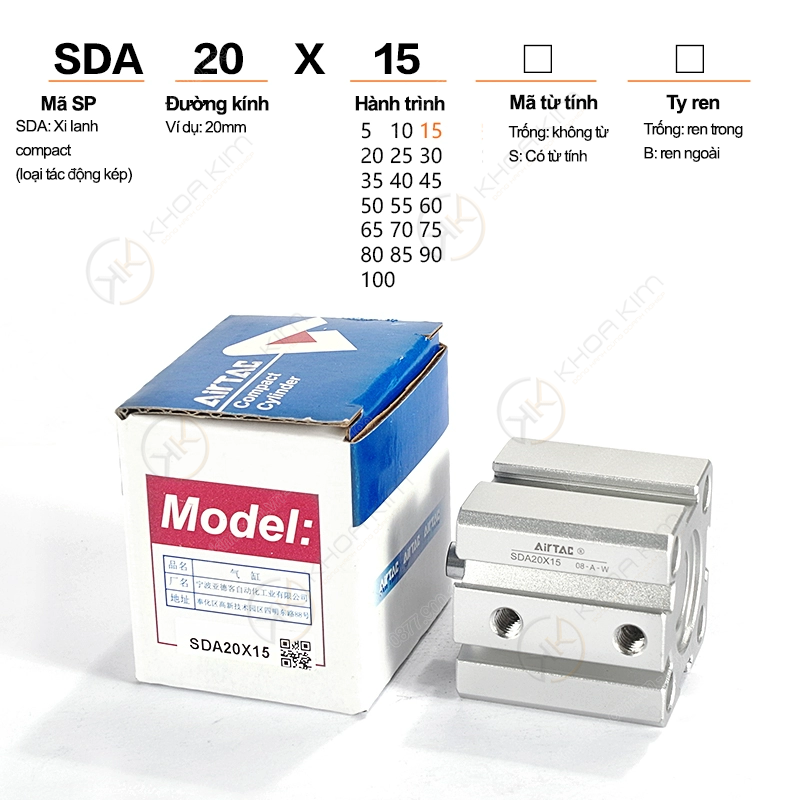Tự động hóa Khoa Kim – Cung cấp xy lanh Airtac chính hãng: SDA compact, MAL mini, SC standard, SI ISO, phụ kiện gá lắp, cảm biến hành trình, van điện từ, cút nối nhanh, ống khí… Ưu điểm của từ tính: bạn giám sát hành trình mà không cần công tắc cơ khí, tăng độ bền & độ tin cậy. Gợi ý chọn nhanh: nếu cần cảm biến “vào/ra” cho PLC, hãy ưu tiên SDA - S. Nếu không cần cảm biến, có thể chọn SDA thường để tối ưu chi phí. Mã SDA - S được đọc theo cấu trúc: SDA [Ø] X [Hành trình] S.
