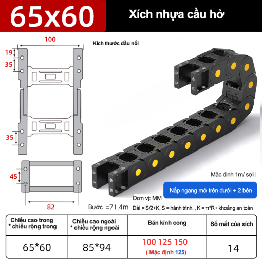 Tỷ lệ lấp đầy khoang khuyến nghị ≤ ~60% để cáp “thở”. Hãy thay dấu “*” bằng số thực tế từng hãng và bổ sung H×W×R, bước mắt xích, tốc độ/gia tốc tối đa theo catalog.Xích nhựa cầu series 5*–65*: nắp kín – nắp hở – tĩnh âm