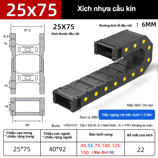 Xích nhựa cầu nắp kín XN25x75 CA NK ( Kích thước trong 25x75mm )