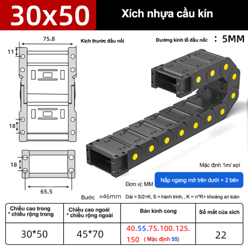 Xích nhựa cầu series 5*–65* bảo vệ và dẫn hướng cáp/ống cho CNC, robot, băng tải, cẩu trục.