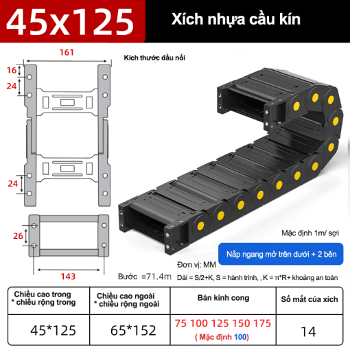 Xích nhựa cầu nắp kín XN45x125 CA NK ( Kích thước trong 45x12mm )
